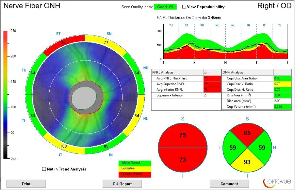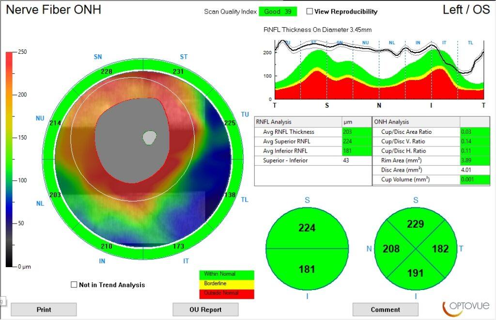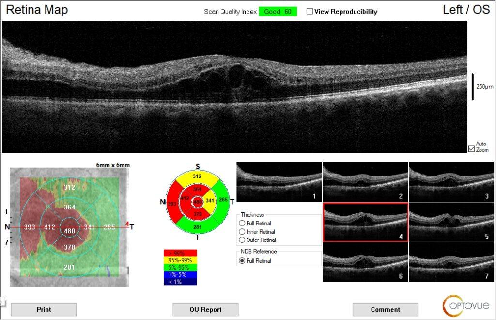 The patient’s entering acuity was 20/20 OD and 20/200 OS. Patient had an APD OS. Fundus examination revealed a few hemorrhages OU due to the patient’s diabetes, optic nerve edema, and macular edema OS. An Optomap fundus photo was taken along with an OCT of the optic nerves and macula.